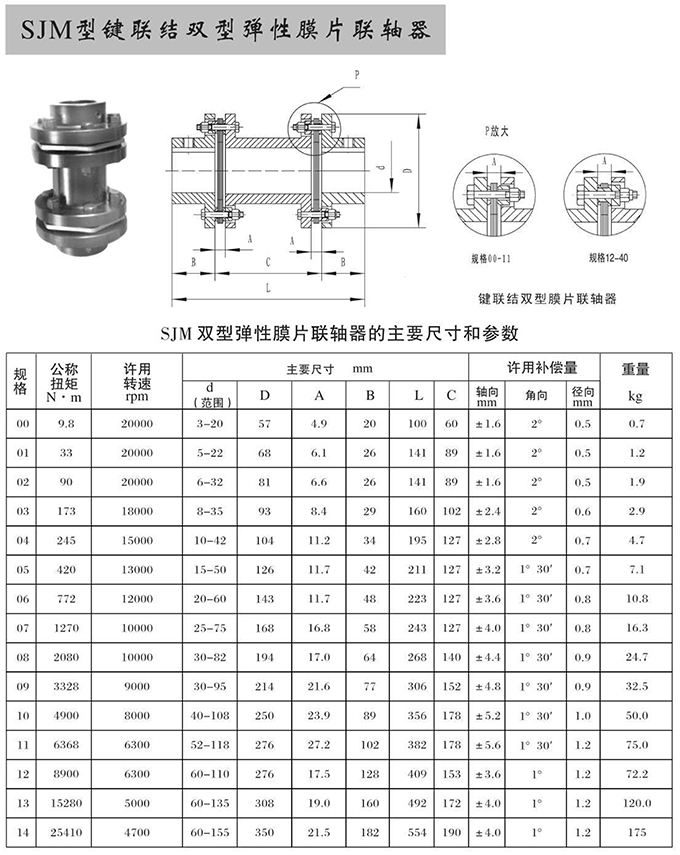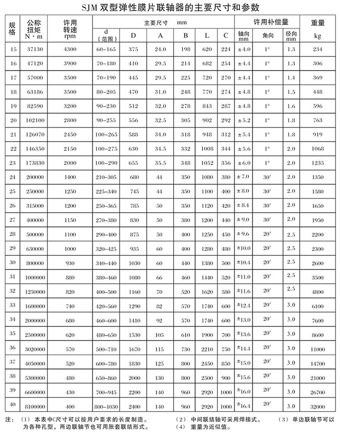瑞安市寶德隆機械配件有限公司提供SJM型鍵聯(lián)結(jié)雙型彈性膜片聯(lián)軸器具有拆裝方便,快速安裝等特點,廣泛用于連接/固定輪轂孔和零件的軸,例如齒輪,錐齒輪,鏈輪,葉輪,凸輪,皮帶輪和飛輪等軸的聯(lián)結(jié)固定,咨詢電話:18906872378