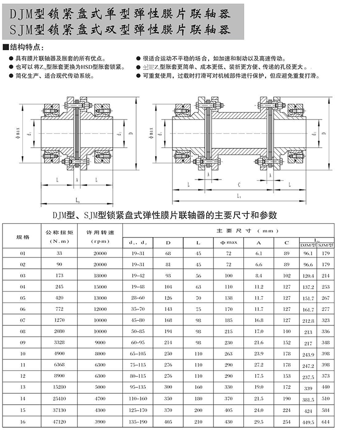 瑞安市寶德隆機械配件有限公司提供DJM型鎖緊盤式單型彈性膜片聯(lián)軸器SJM型鎖緊盤式雙型彈性膜片聯(lián)軸器具有拆裝方便,快速安裝等特點,廣泛用于連接/固定輪轂孔和零件的軸,例如齒輪,錐齒輪,鏈輪,葉輪,凸輪,皮帶輪和飛輪等軸的聯(lián)結(jié)固定,咨詢電話:18906872378
